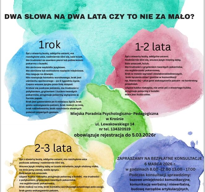 Z okazji Europejskiego Dnia Logopedy serdecznie zapraszamy do Miejskiej Poradni Psychologiczno – Pedagogicznej w Krośnie. To doskonała okazja, by dowiedzieć się, jak wspierać rozwój mowy dziecka, porozmawiać z logopedą i uzyskać fachowe wskazówki. Akacja adresowana… 6 marca 2026 – Europejski Dzień Logopedy