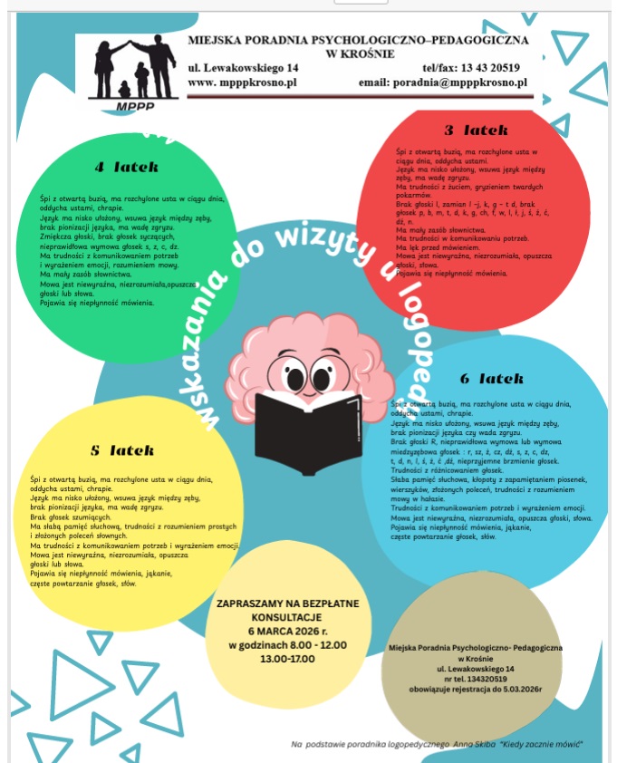 To doskonała okazja, by dowiedzieć się, jak wspierać rozwój mowy dziecka, porozmawiać z logopedą i uzyskać fachowe wskazówki. Akacja adresowana jest do rodziców dzieci w wieku od 0 do 6 lat z uczęszczających do placówek na terenie Miasta Krosna. Wymagane są wcześniejsze zapisy w sekretariacie Poradni lub telefonicznie: nr tel. 13 43 205 19. Rejestracja jest konieczna ze względu na ograniczona liczbę miejsc. Chęć udziału w bezpłatnych konsultacjach należy zgłosić do 5 marca 2026r.